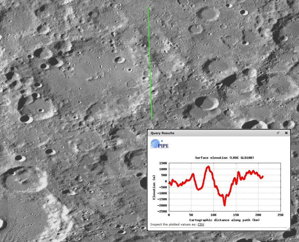 With the Webcam out I decided to bag 4000 frames of this crater, before I moved on to Jupiter. Everything still looks a little soft, but trying to sharpen even further doesn’t help. Looking at the image it’s hard to see why that shaft of light would be created. I went to the LRO website and plotted an elevation graph at 90 degrees to the light source and on the craters edge and you can see from the plot the notch in the crater wall that would support this.