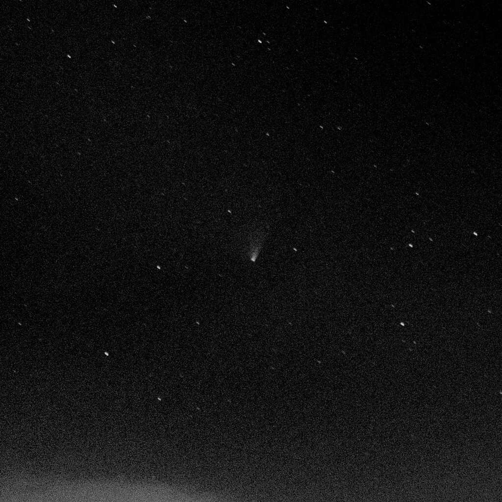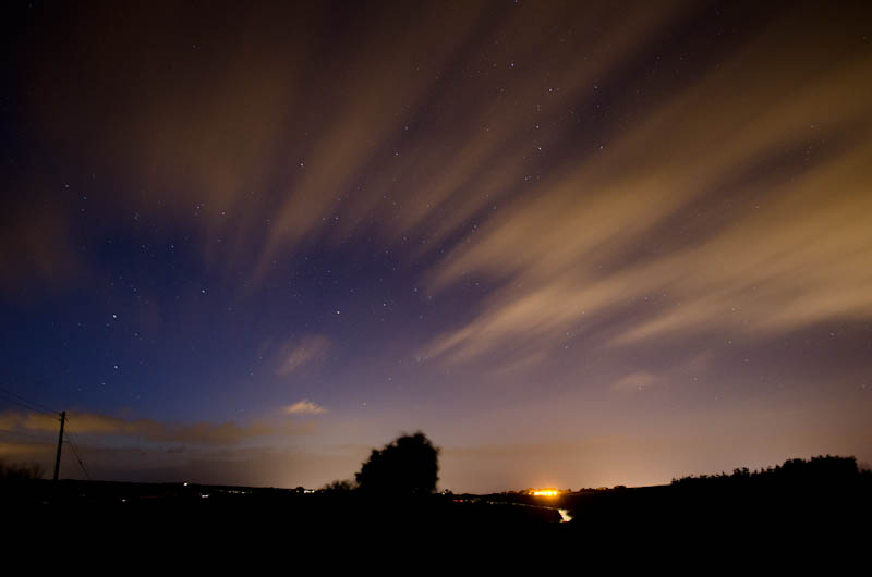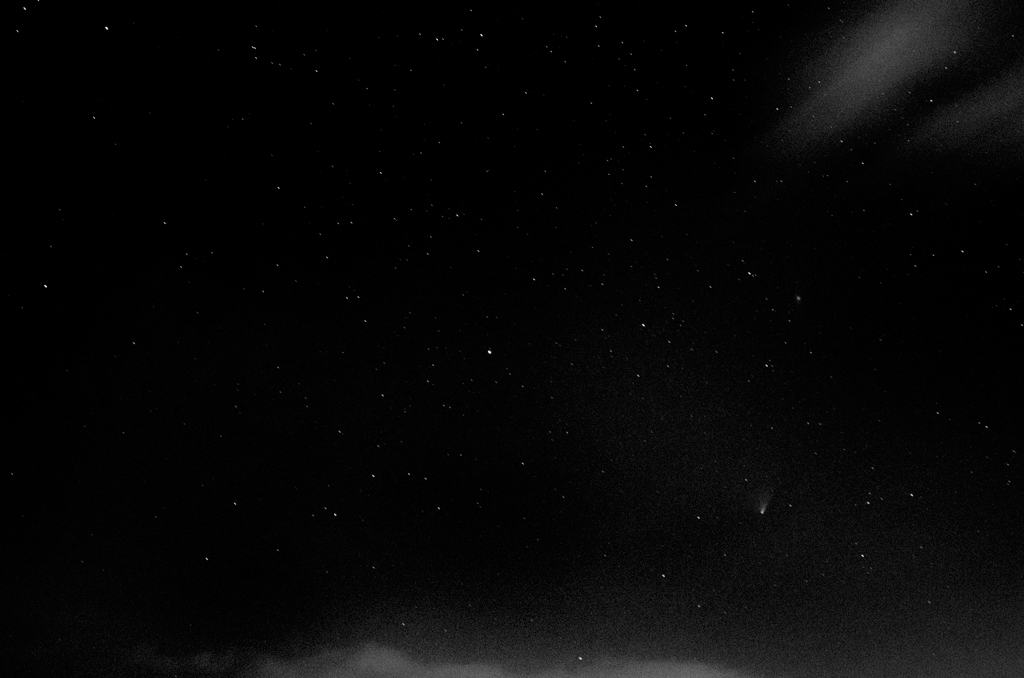 Not being able to get a camera on the scope, the only way to image the comet was to use the DSLR on a tripod. Being at such a low altitude, I stared to get star trailing after 10 second exposures, so had to up the ISO to 1600 in order to get a decent degree of detail. I also had to time my exposures in between gaps in the clouds scudding across the sky.