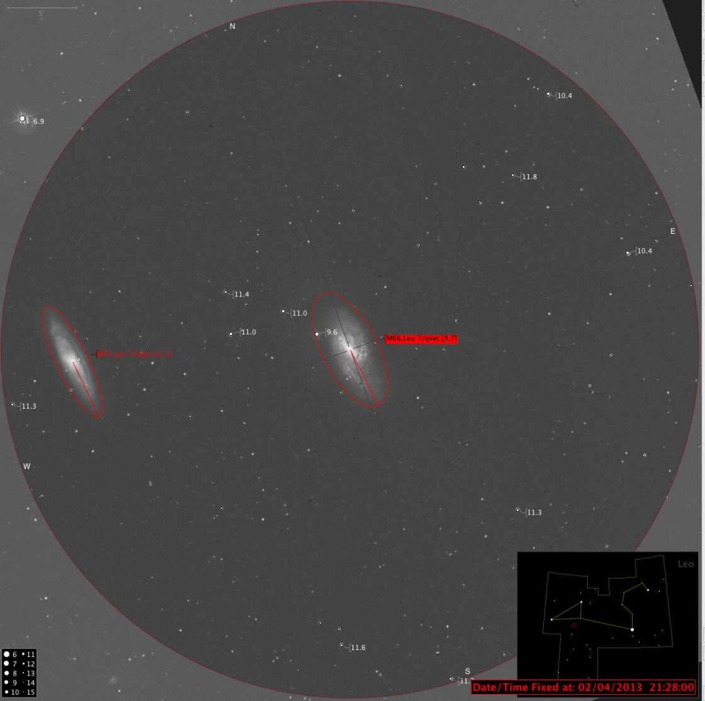 M66: Easily seen with the longest dimension orientated N/S in the FOV. No actual shape other than ovoid could be made out, except for one fleeting moment when the galaxy took on the form of a ‘comma’ at x113. No amount of magnification made any difference to the detail seen. When viewed with the 40mm both M66 and M65 filled the FOV. The only stars visible were the four (ranging from 9.6 down to 11.4 mag) located N/W of the galaxy. See notes on M65