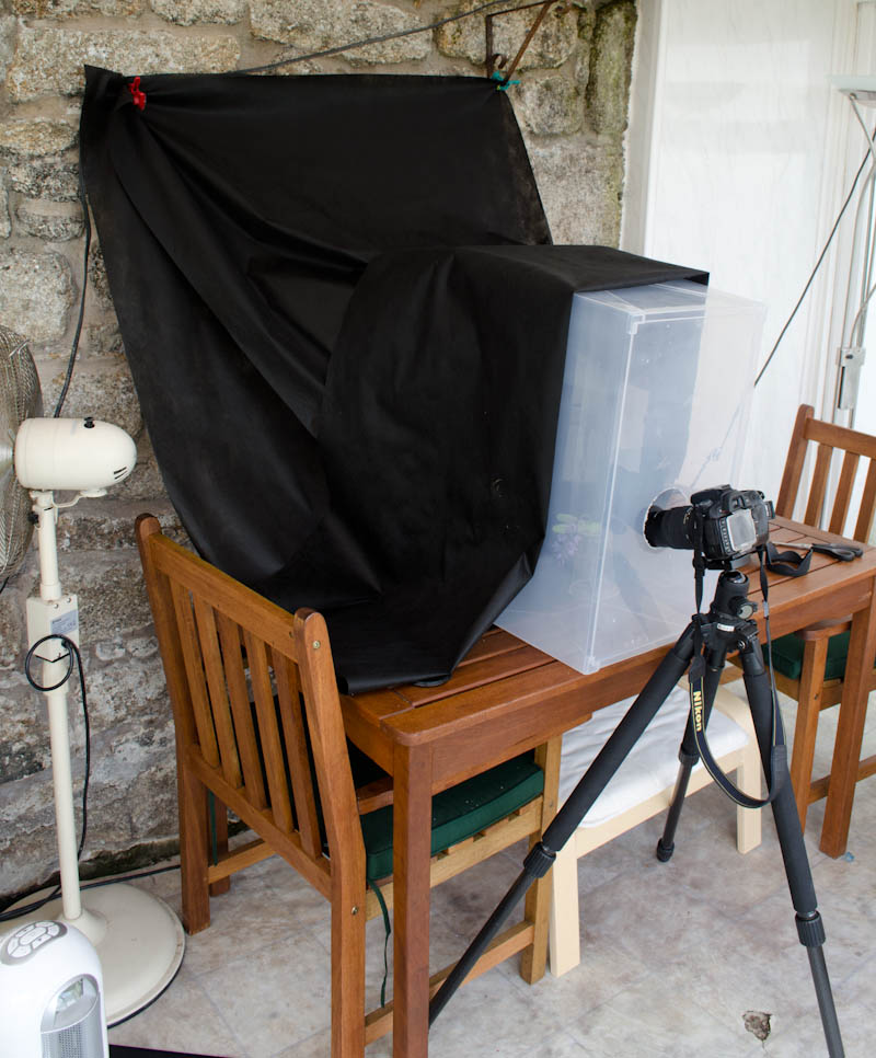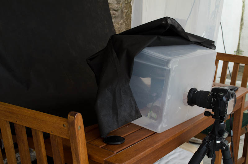 Having done a bit of still life in the studio, I wanted the subject to be in front of a dark background. The light on the subject needs to be diffuse but well illuminated, but the background doesn’t. For the diffuser, we found a semi transparent bin and cut a hole in the base into which the lens is poked through.