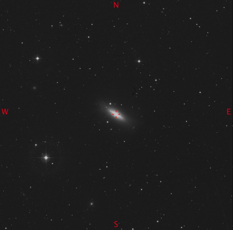 In the Altair Astro 250mm, Delos 14mm, 145 X, 29.8′, I can just make out two faint stars just above and below the galaxy forming a line running 1 to 7 o’clock. These are ID/s: ASCC195157 Magnitude: 11.4 and ID/s: ASCC195155T Magnitude: 12.2.