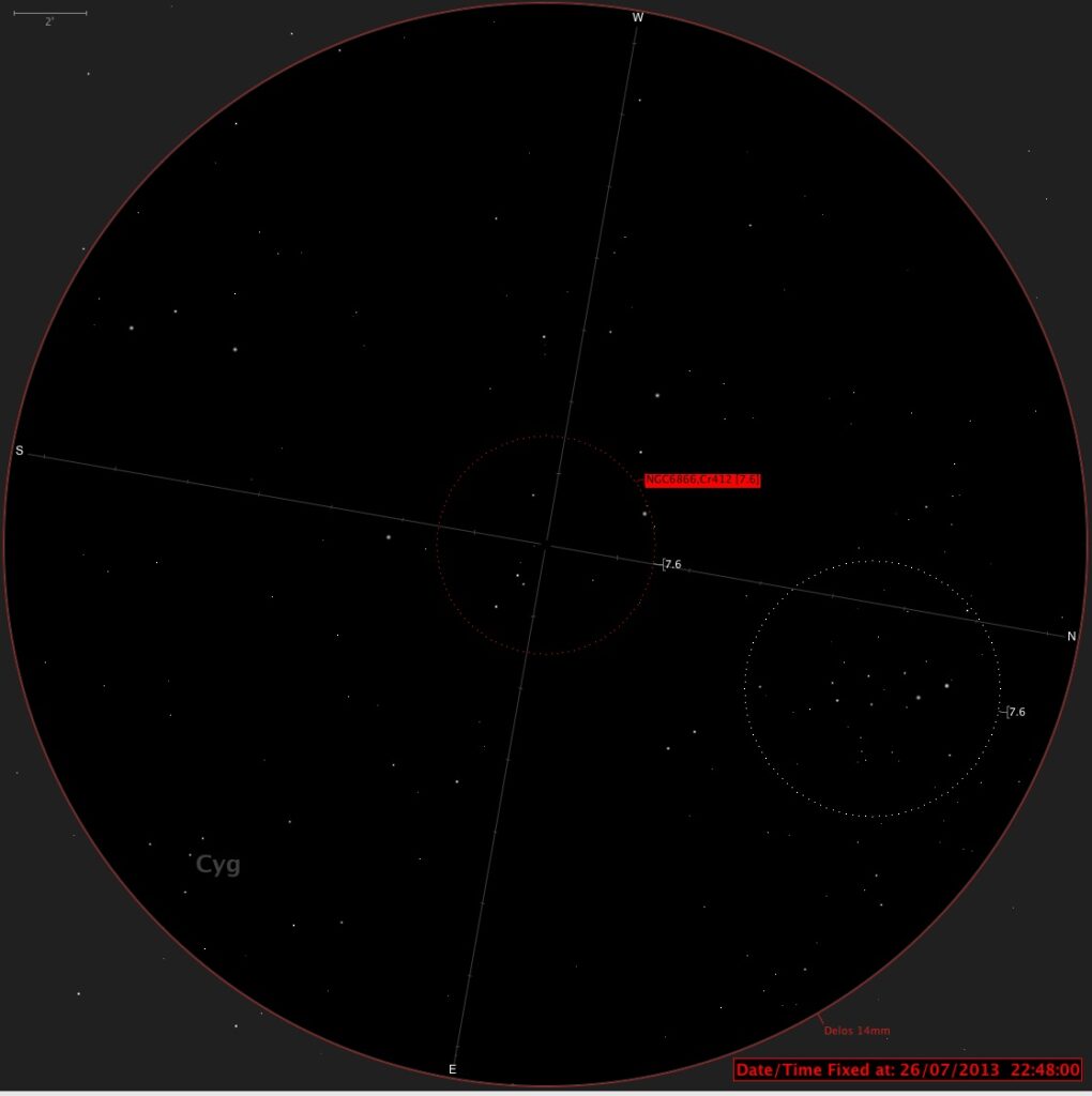In the Altair Astro 250mm, Plossl 40mm, 51 X, 50.8′ West is to the 9 oclock and I can see three stars forming an ‘L’ towards the S/E. Images show the cluster to be obvious, but I saw zippo!
