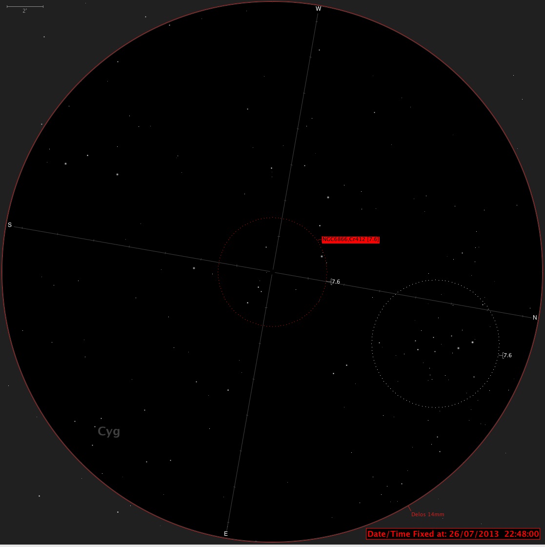 In the Altair Astro 250mm, Plossl 40mm, 51 X, 50.8′ West is to the 9 oclock and I can see three stars forming an ‘L’ towards the S/E. Images show the cluster to be obvious, but I saw zippo!