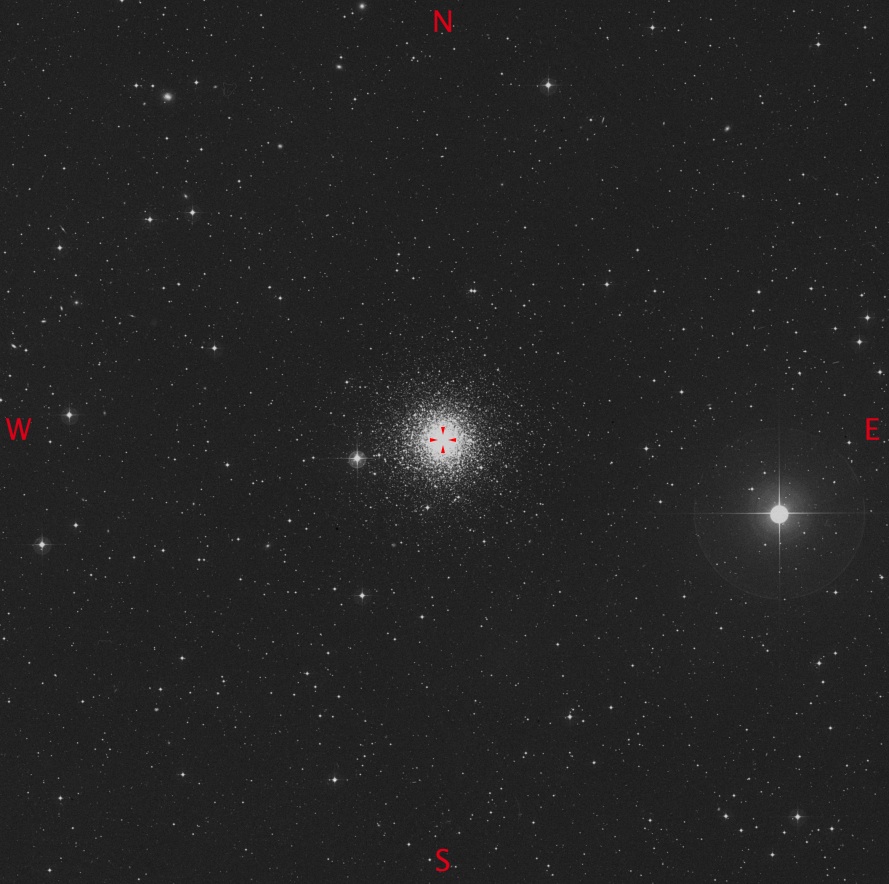 In the Altair Astro 250mm, Delos 14mm, 145 X, 29.8′  West is to the 10 o’clock. When first observed it looks like a four legged starfish, but avert your vision and the core area really pings back into a circular ball and brightens up like the light has just been turned on. The overall view is of a faint, hazy ball shape, with a scattering of bright sparkly gems overlaid on top.