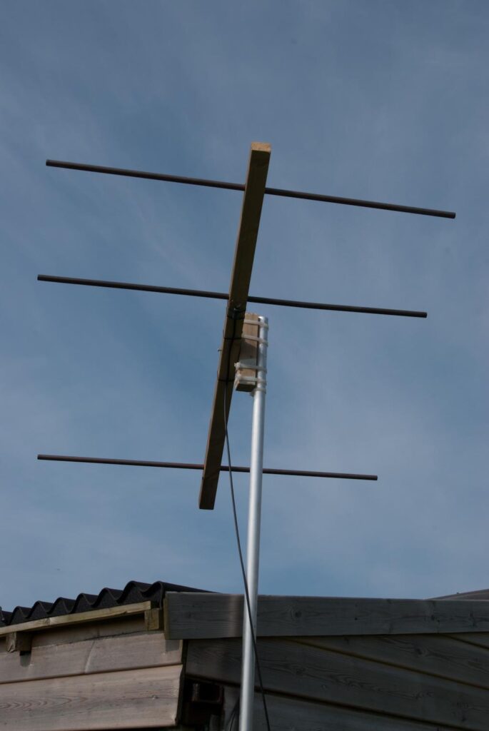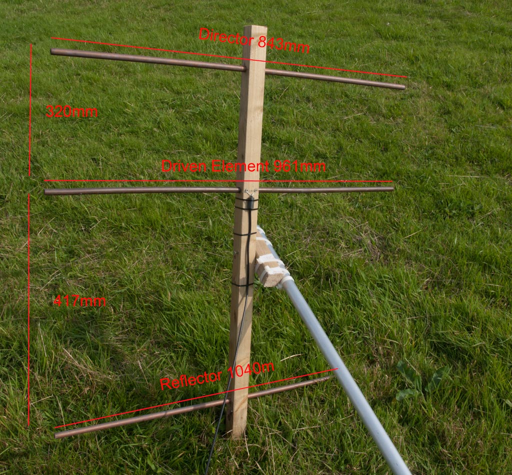 While it is possible to buy a Yagi antenna capable of receiving  the  2 metre band we need, it was far simpler and cheaper to build our own. The web has a number of sources of dimensions suitable for this frequency, and we made ours using offcuts of 50mm square wood and 15mm copper plumbing pipe.