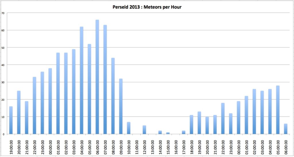 The Perseid peak was rapidly approaching so I fired everything up  at 17:00 GMT on the 12th and allowed it to run until 07:00 GMT on the 14th . This produced a number of files totally about 25GB of data.  These are then opened up in SDR’s Frequency Analyser, where it was just a case of counting up the number of reflections for each hourly period.  This data was then loaded into Excel, where it was plotted onto a bar chart.