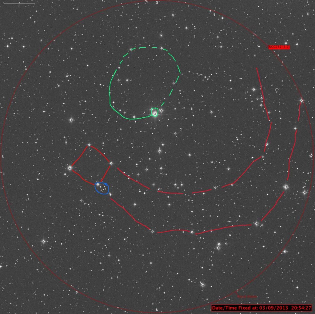 The bright star at the 12 oclock is HD11885 and this forms the right hand side of a cup shape group of stars heading off to the 10 o’clock. Stare for a little longer and this cup shaped curve continues round until you end up with an egg shaped oval.