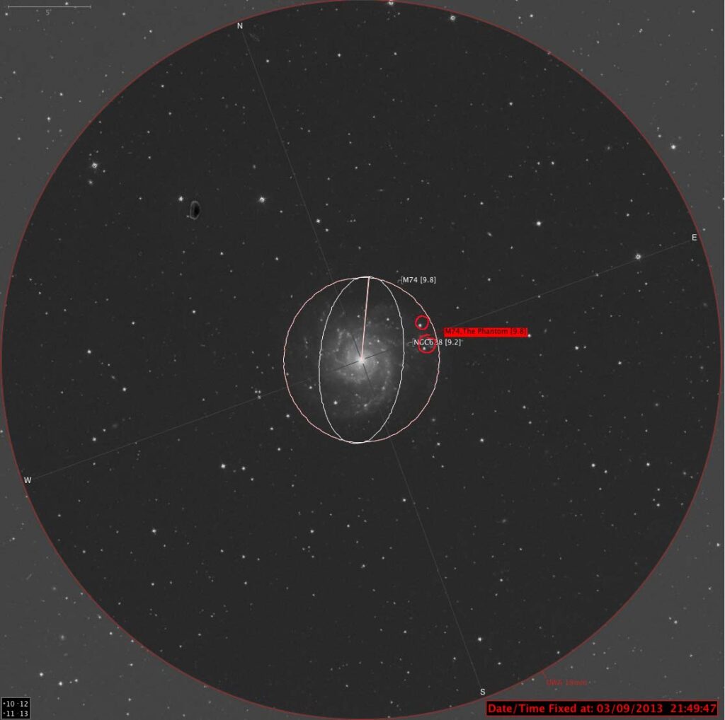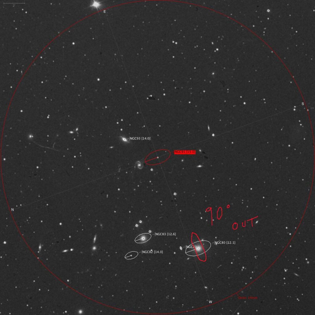 M91 is just off centre of the FOV, but at 15th mag, it’s only just visible with averted vision. Off to the the 5 and 6 o’clock,  are what look to be 3  fuzzy stars which the chart says are the galaxies NGC 80, 83, and 82.