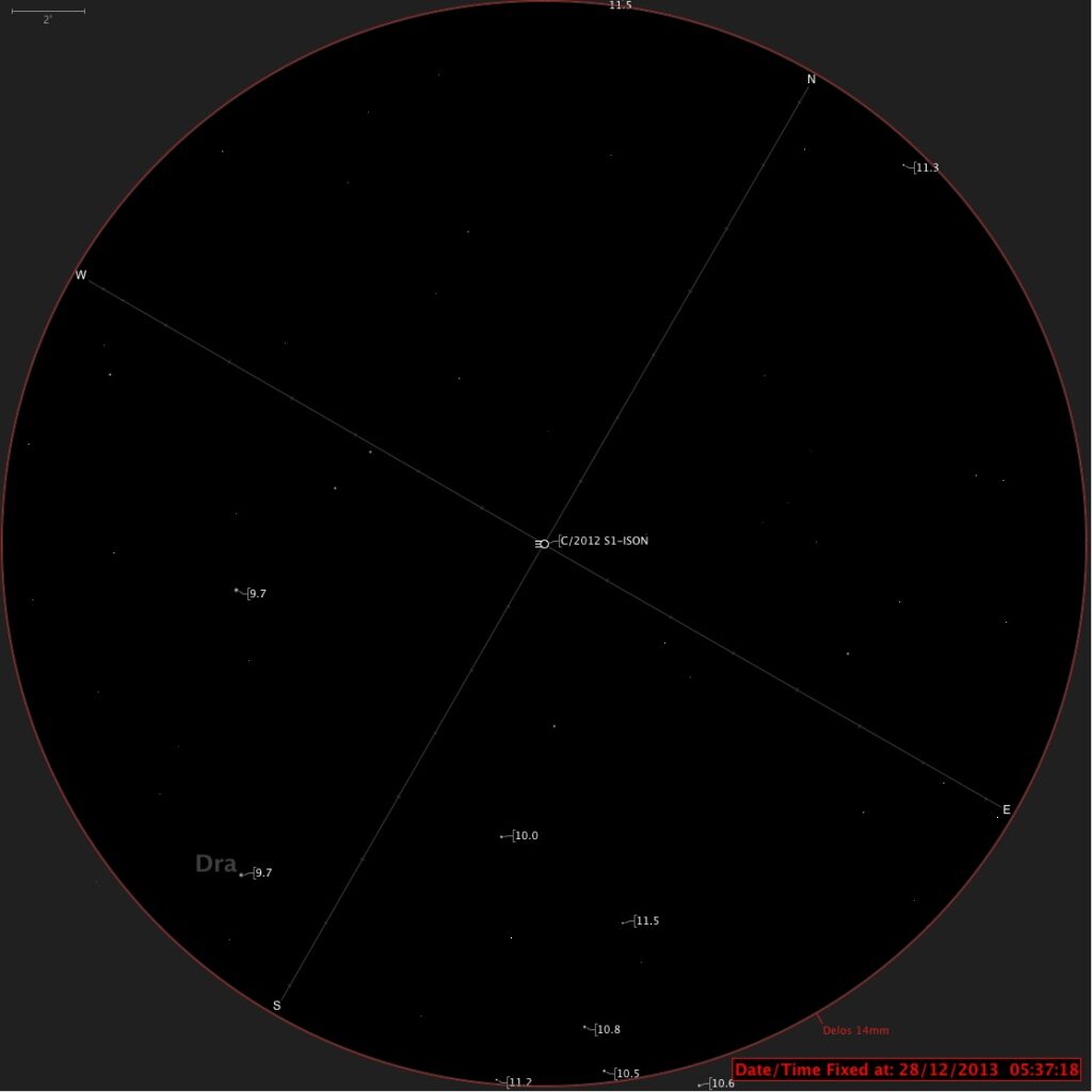 It wasn’t until I got back in and hunted through the menus, that there is an ‘Update Comet Data’ tick box in the ‘Refresh Objects from Catalogue’ drop down buried under a couple of other ‘Right Click’ menus. When I did this and compared the old and new positions, I still should have seen ISON, as both were showing in the same FOV of the 14mm. If ISON was in the FOV then it certainly wasn’t observed. Either that or the pointing was off enough that it wasn’t in the FOV at all. I did think of this at the time and did a quick slew to Vega, which wasn’t far away. While not smack in the centre of the FOV of the 14mm , I re-centred it, did a ‘Sync’ and slewed back to ISON – but still diddly.