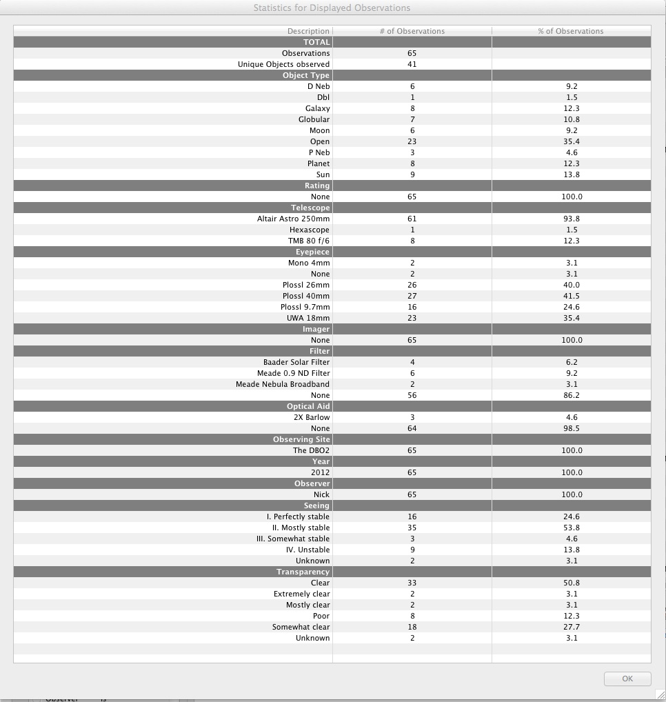 It was difficult to judge how successful 2013 was for observational astronomy at the DBO, but fortunately Astroplanner can display all sorts of interesting stats. The one thing the table doesn’t show are the number of clear nights that I was able to open up though. Manually counting those came to 33 nights or 9%. While that doesn’t sound a lot, it’s more that I thought we had, so maybe 2013 wasn’t all bad. I’ve included data for 2012 for comparison.