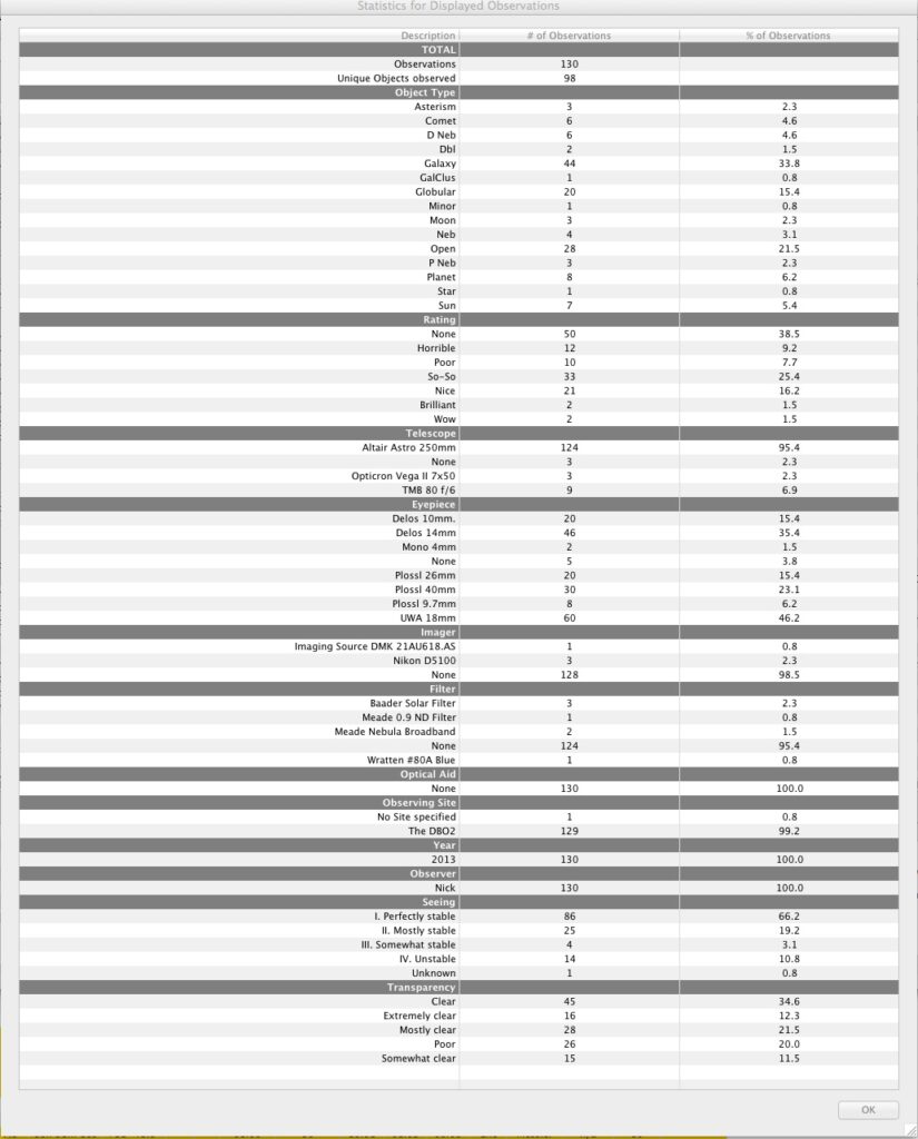 The two new Delos eyepeices are getting lots of use, but I see my trusty Meade 18mm SWA is still making the lions share of the observations . I’m tempted to replace it with a Delos 17mm which will give a similar FOV – and a better quality one – but for 2014 I think my hated Meade 40mm just has to go. I’m rather taken with Televue’s 31mm Type 5 Nagler so it looks like this will have to go on the shopping list come the Astronomy Fair in Warwick.