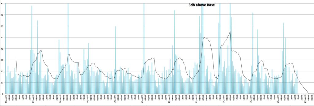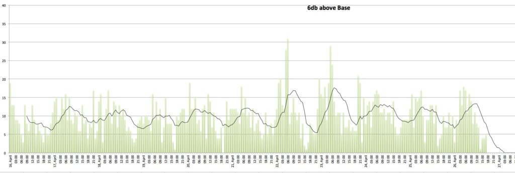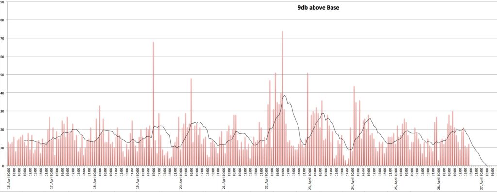 All very confusing until you look at the graph on the IMO’s website https://www.imo.net/live/lyrids2014/ when things start to look a little clearer. Their chart shows a cluster of observations at midnight on the 21st, 22nd and 23rd. The peaks for the 22nd and 23rd correlate well with the 3db and 6db chart, but not with the higher power returns on the 9 db chart, where I’m recording much higher power levels on the 22nd.