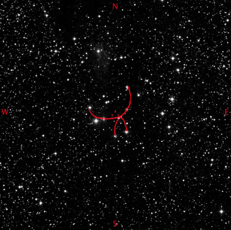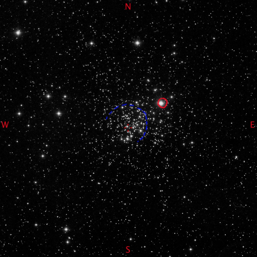 There is a group of 9.0 mag stars to the S/W  which form a reversed  ‘?’ ( marked in Red on the image) with the head pointing towards the N/W.  To the N/E of  this is Berkeley 3, which is very, very small.  Blink and you would miss it, as the whole FOV is filled with a random sprinkling of very faint stars, some of which also form small cluster groups!!