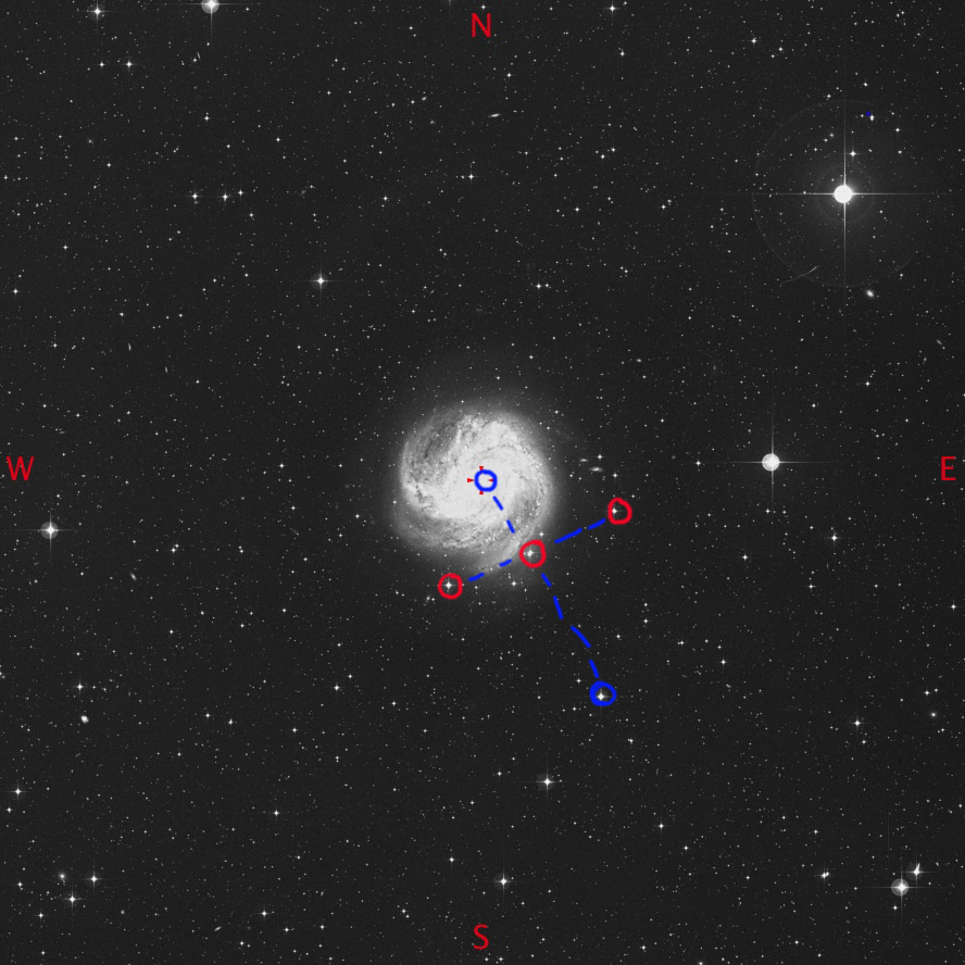 If I move the galaxy core to the West a little, a fourth 9.0th mag  star appears at the edge of the FOV at the S/E.  When look again all these stars and the galaxy core form a miniature Cygnus ( marked in Blue on the image) with the 9.0 mag star being Albireo and the galaxy core being Deneb.