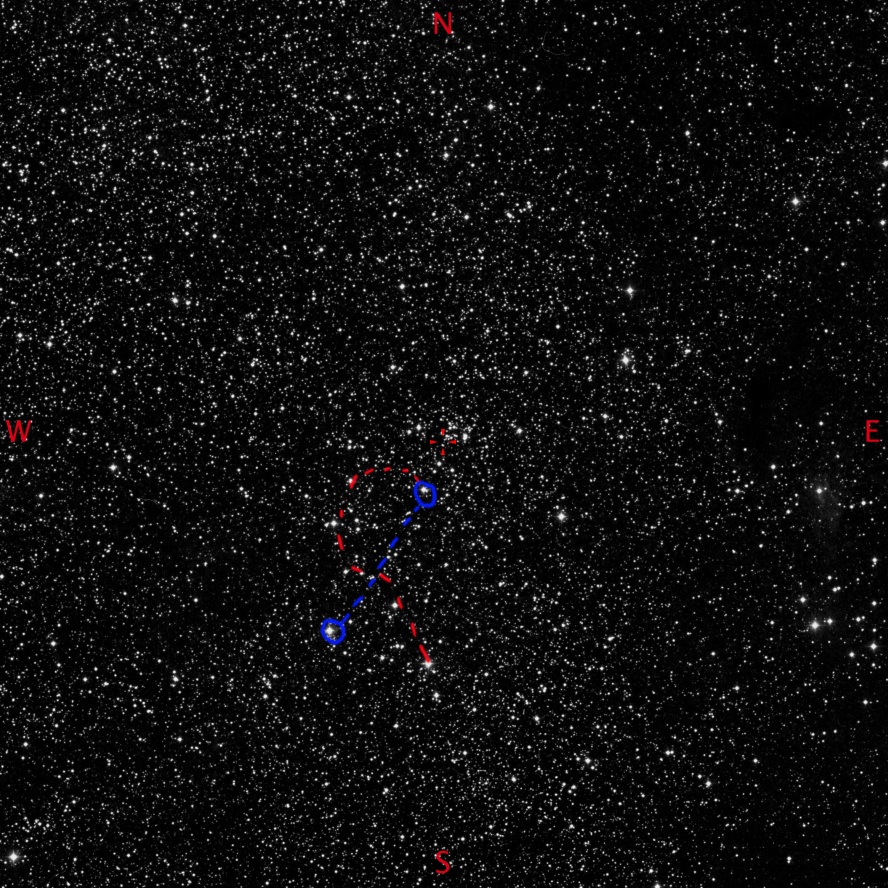 Changing to the  Altair Astro 250mm, Delos 14mm, 145 X, 29.8′, provides the best views. This cluster is very very small and seems to consist of five or six 10.0 to 13.0 mag stars. Looking at the DSS image later, you really wonder how you would decide these stars were a cluster as opposed to any other grouping of stars in the FOV.