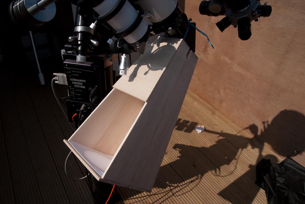 A few bits of Balsawood, some Cyno and a couple of days work and Bingo, this is it. The box slides over the eyepiece end of the diagonal. There is a flat there which provides a reasonably amount of rigidity. At the moment, I’m tying it on with string, but thin  elastic shock cord should do the trick on the finished version.
