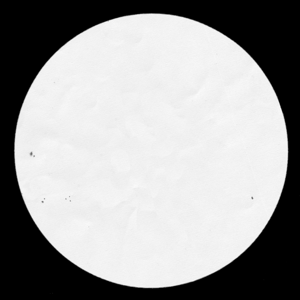 Before plotting the Sunspots, I had to mark the East/West orientation so the image can be aligned correctly when scanned into the Helio viewer Software  This is dome by turning off the scope tracking, marking the position of a prominent spot and  marking where it ends up after a few minutes . The line between the two marks is your East/West track.  I then used a softish pencil and marked the positions of the few Sunspots that were visible.