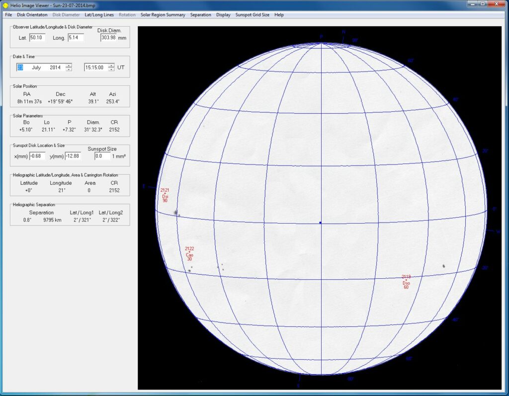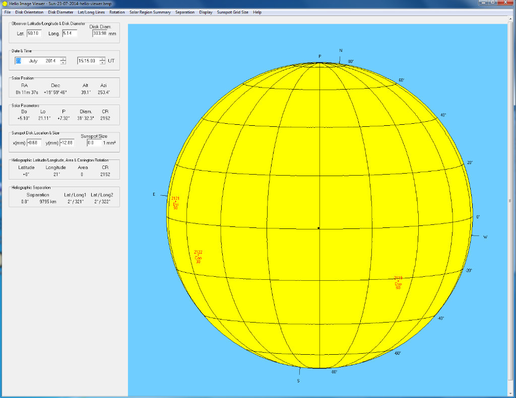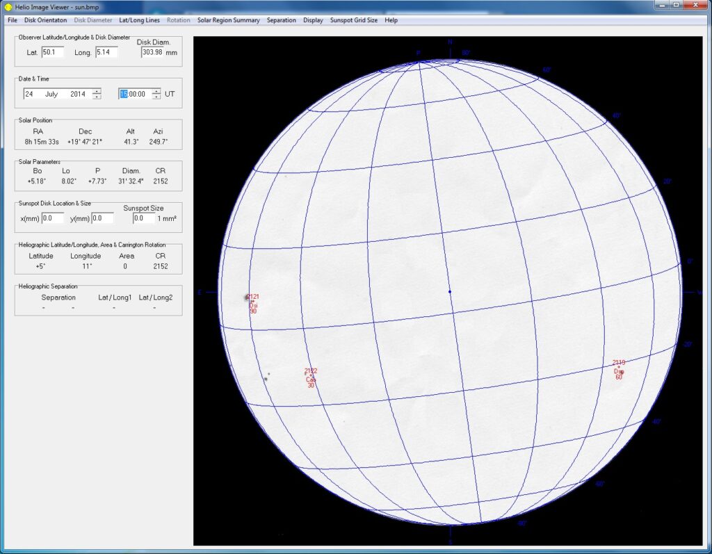 The finished drawing was then scanned into Photoshop and rotated using the ruler tool , so that the East/West line was aligned horizontally. I then had to black fill outside of the 152 circle on the paper, so when the scanned image is loaded into Helio viewer, the software is able to detect the size of the image and scale all the overlay data correctly.  The Sunspot data overlay is imported as text files for that day, from the Solar Region Summary pages on the NOAA website