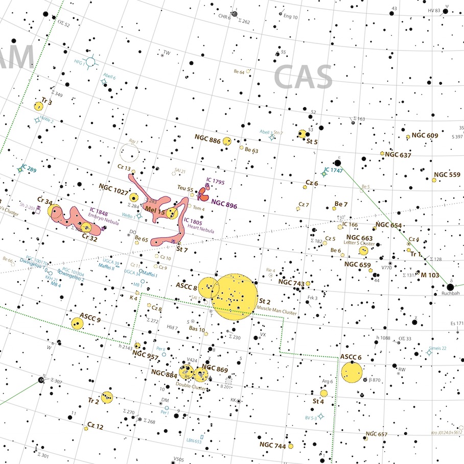 Upon opening it, you realise that it very closely duplicates the information in Willman Bell’s Uranometria 2000.0 atlas. Both have a similar map scale (Uranometria 1.85cm per degree – Interstellarium 1.5cm per degree) and show stars down to about 9.5 mag. But the really big difference is in the colouration of various deep sky objects in Interstellarium’s version. Objects are coloured according to the visibilty when seen through various apertures of telescope. The three coloured shades represent views though a 100mm, 200mm and 300mm scopes. This makes it obvious what objects are worth hunting down and which ones you can safely ignore.