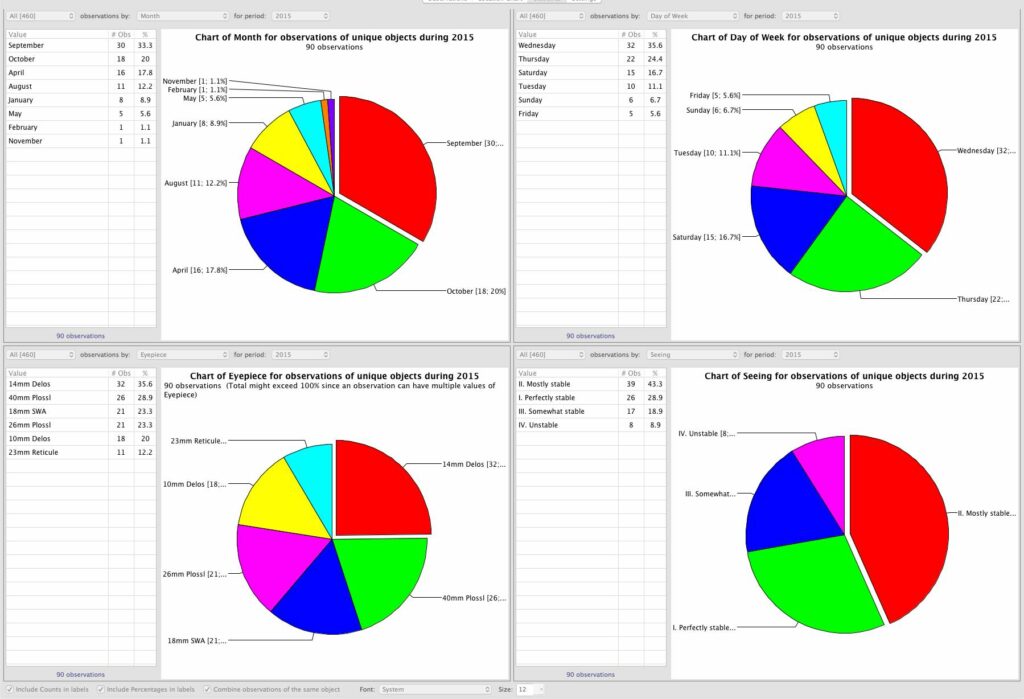 Astroplanner produces charts for all sorts of useful stats for the year – Like Wednesday’s produced more observations than any other day of the week, or that my 14mm Delos and 40mm Meade eyepieces account for the lions share of views made through the scope, or that 43% of observations are made in ‘Mostly Stable’ seeing conditions.