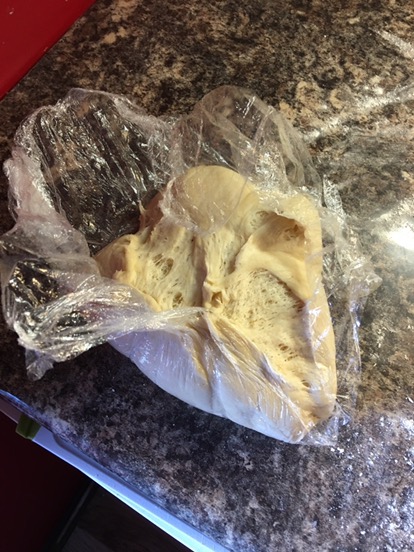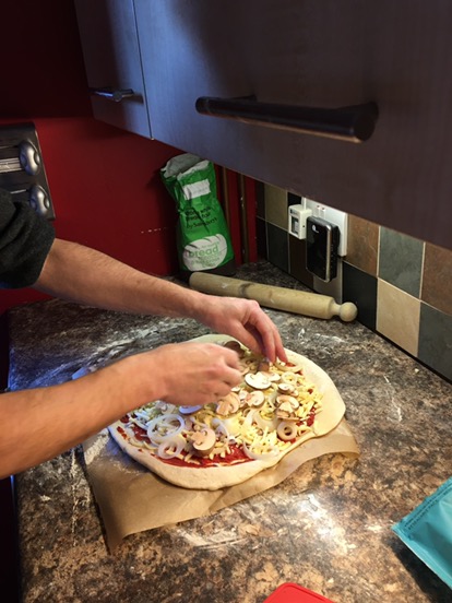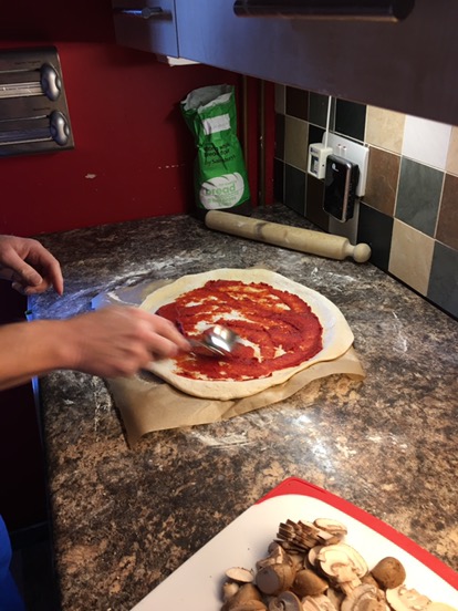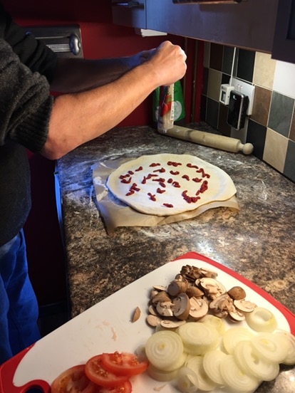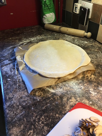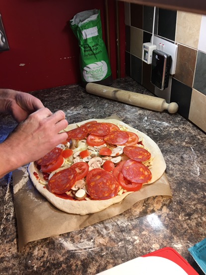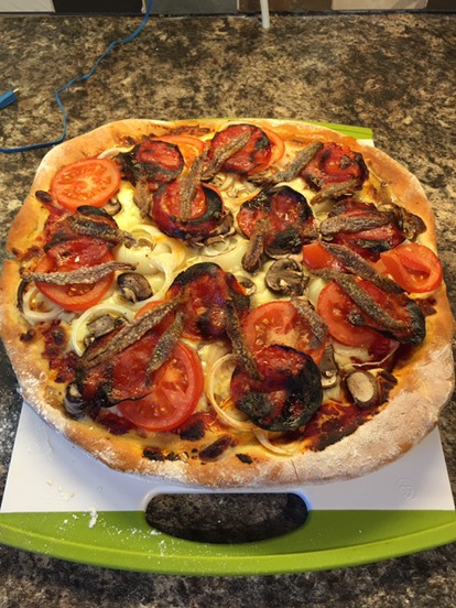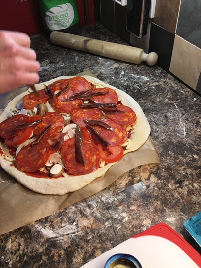 As to what be put on top….. well anything you like. But this had Mozzarella, onion, sliced tomato, tomato puree, pepperoni, anchovy, mushroom, garlic and we seem to have missed the black olives. Cook in the over for about 15 mins at 180C
