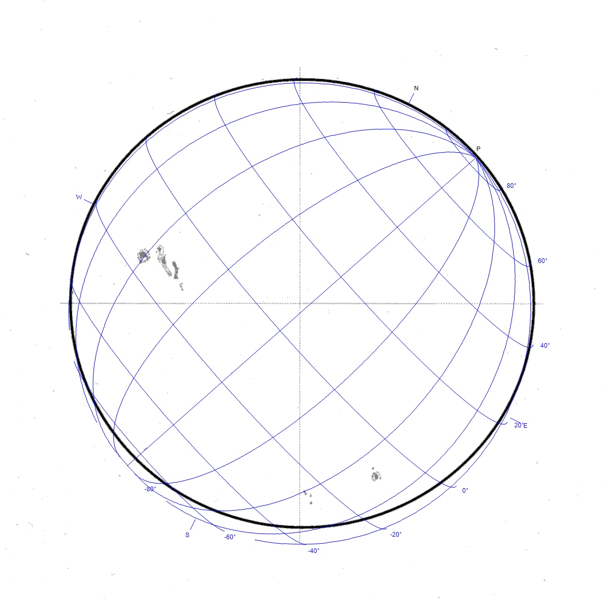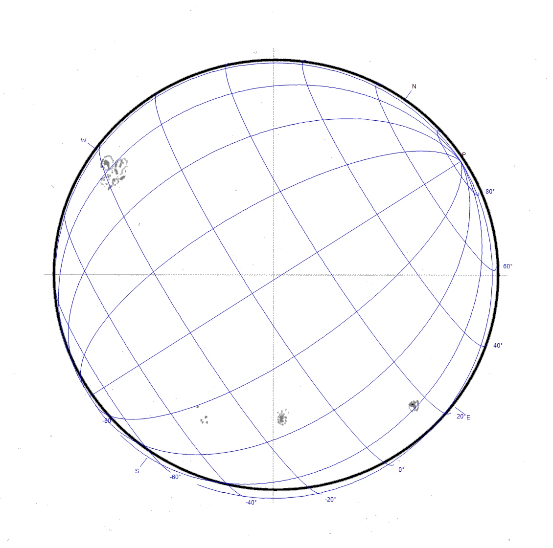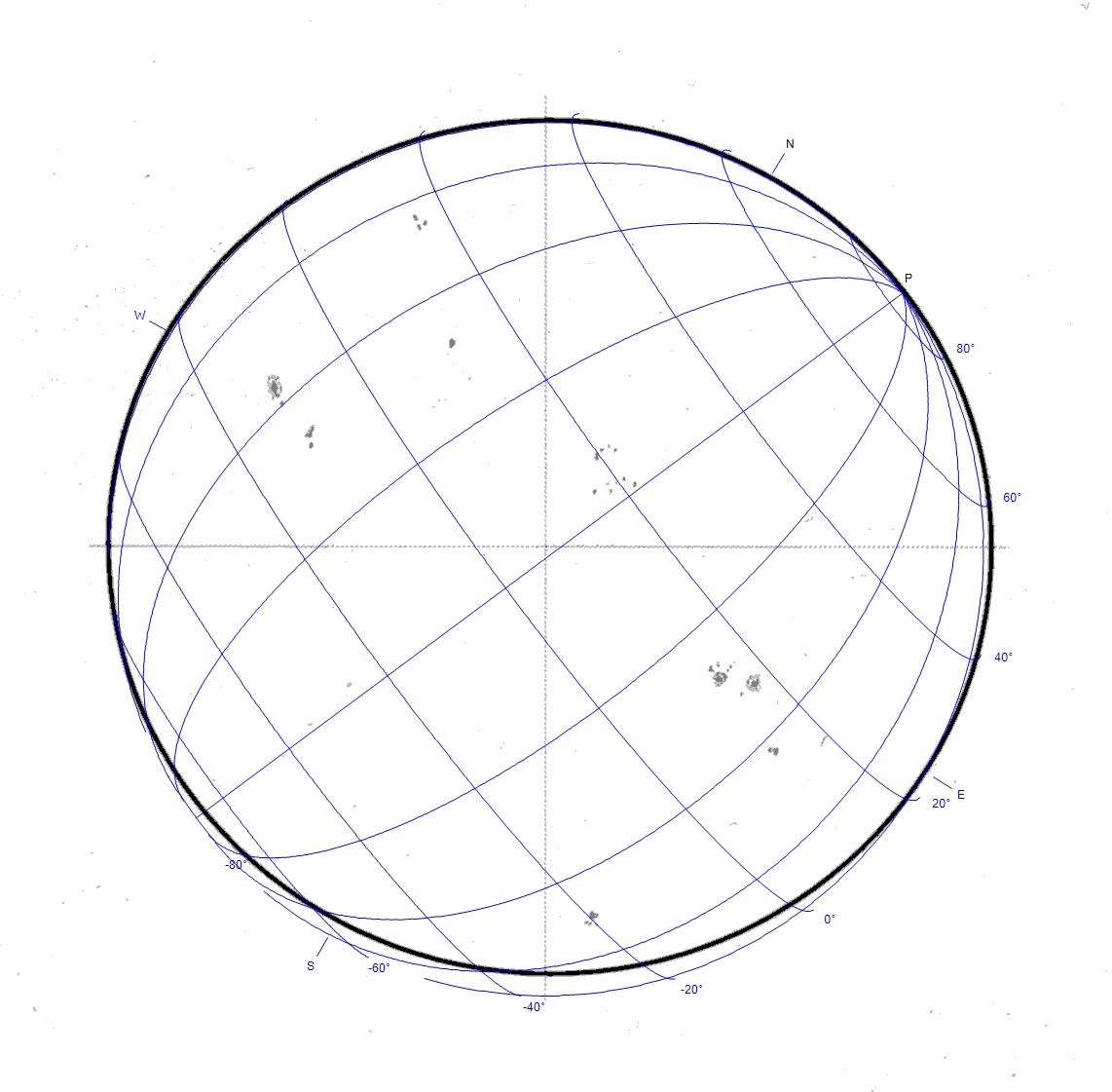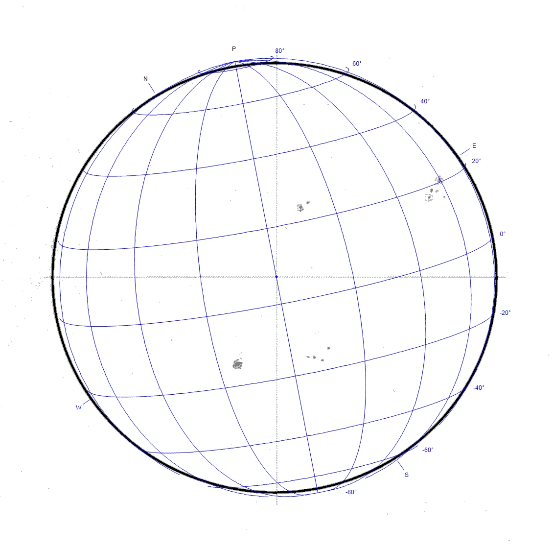 The following are the drawings made at the eyepiece and are displayed with the Zenith up with the second image with a Helio Viewer cardinal overlay. Click the image to see a full-size preview.