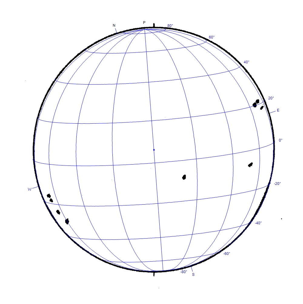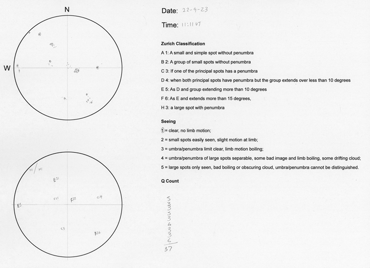 Compare that with today. My drawing sheet shows the orientation of North and West and this is aligned to Equatorial East/West of the mount using a crosshair reticle. I’m now calculating ‘Q’ using the Zurich Classification. This is done at the eyepiece, but if I find that when loading the scan into Helioviewer that the group is smaller or larger than the 10-15 degree limits, then I can change the classification before posting. After I have made the drawing, I do compare it to the SIDC daily drawing – if there is one – to check my results. Any massive howlers are corrected, but generally, I leave things as I saw them and learn from the experience until next time.