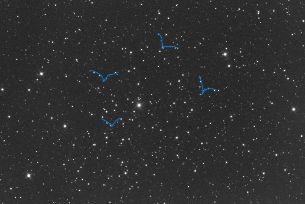 This is quite a loose open cluster. At its heart is the variable star FG Vul. It’s difficult to suggest where the outer edge of this cluster is and on looking at its calculated size, indicates it goes out of the frame somewhat. I need to revisit this one and observe with the TMB