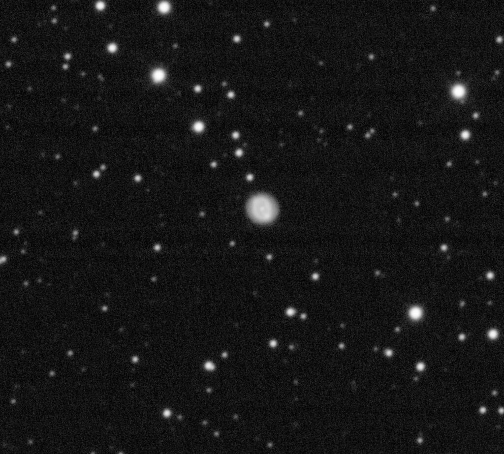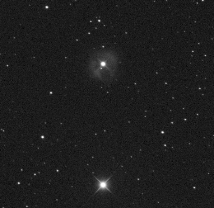 Quite a large small planetary with a diameter of 2.5’. The really bright 9.6 mag star at the centre has diffraction spikes and this seems to have cleared all of the dust and gas from its immediate surroundings. This clearing is not symmetrical though and it cuts through the illuminated ring at the Southern edge.
