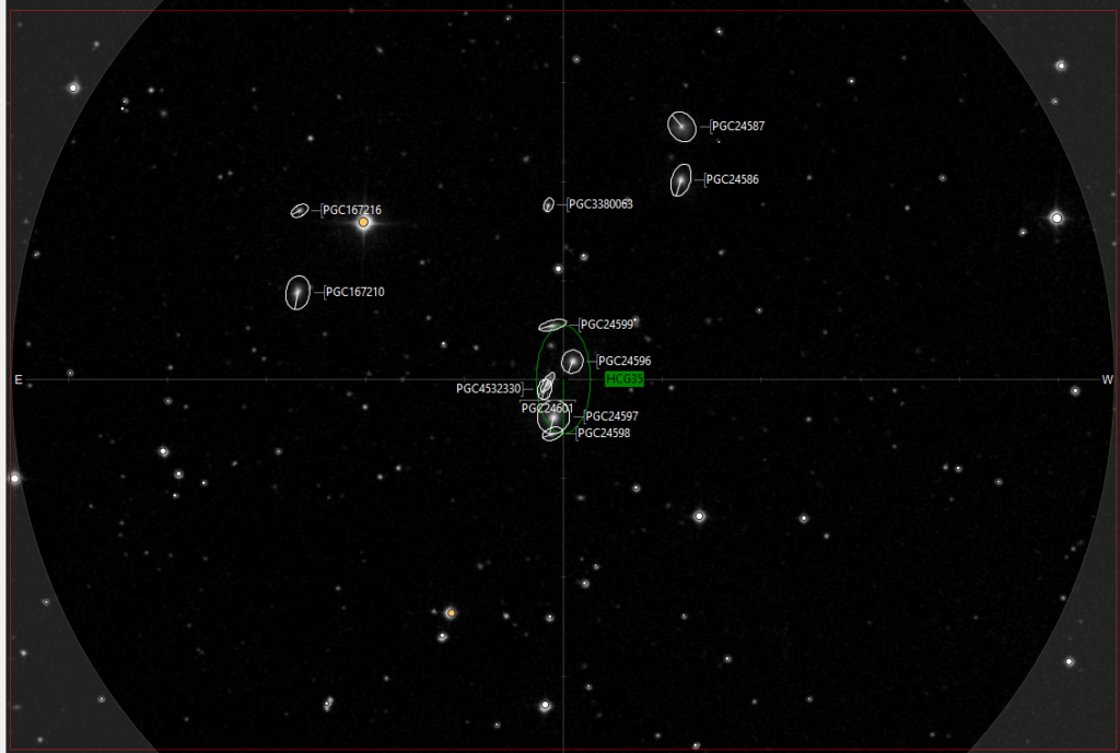The Hickson 35 group is made up of 6 galaxies, I’ve listed these in North to South order. PGC24599, PGC24600, PGC24596, PGC24601, PGC24597 and PGC24598. All of these are clearly visible, although PGC24598 almost looks stellar.