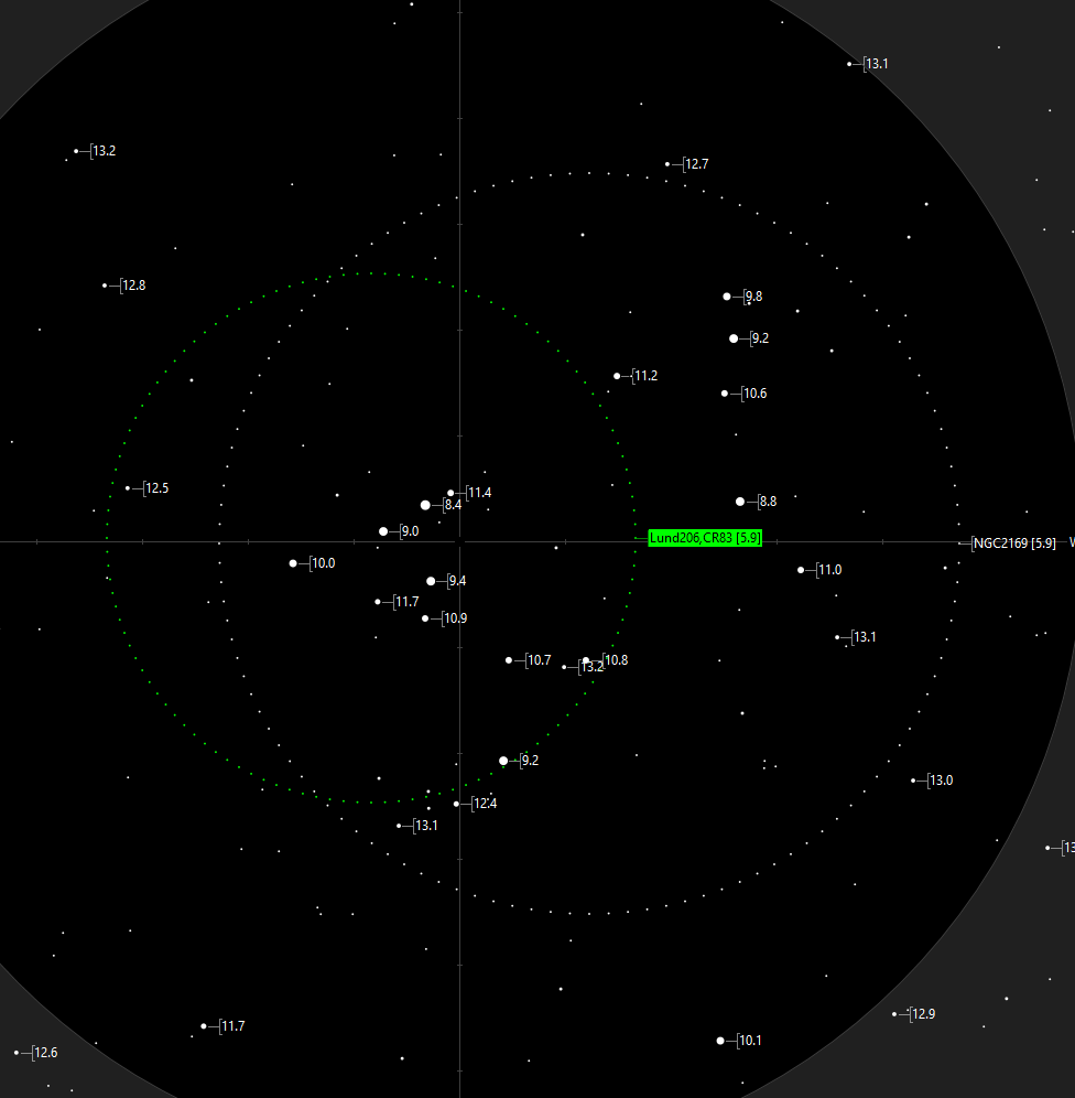 He then gives the size of this cluster at 5×4 arcmins. If you overlay the coordinates for Lund 206 with that of the NGC2169, CR83 is a little smaller and about 2 arcmin to the East of NGC2169.