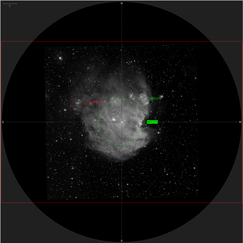 3 arcmin to the East is a bright patch of nebulosity surrounding a couple of stars of differing magnitude. 11 arcmin to the NW is NGC2174. I’m not quite sure why this was regarded a something separate as it doesn’t look as bright as a bright patch 5 arcmins to the East of it.