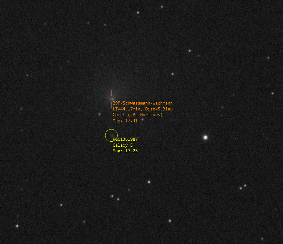 There isn’t any evidence of a tail here but I can just make out a faint coma which extends to the North. I can also make out the fuzzy blur of galaxy PGC1361987.