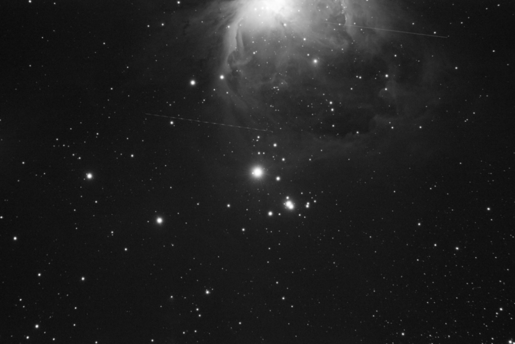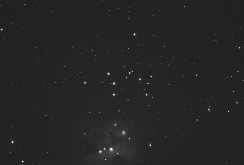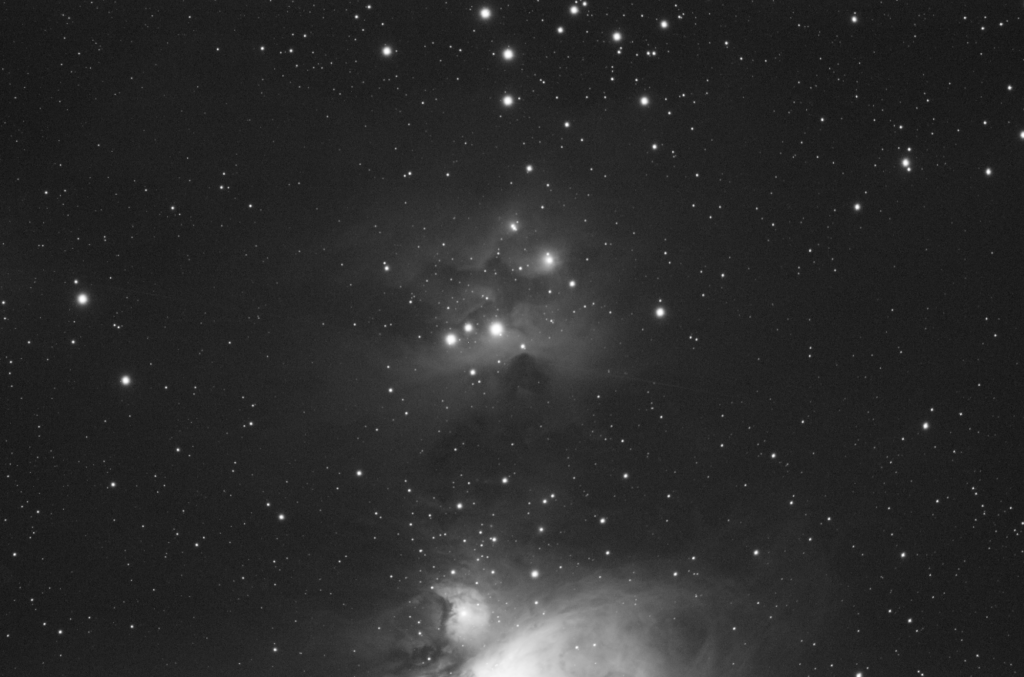 It’s not that NGC1977 isn’t pretty and you can quite plainly see the Running Man figure, but what shouted out at me on first seeing this 6 minute stack was the area of dark matter to the South of the running man figure. Is that a horse or dog head, that is detached from the faint remains of its body. I’ve never noticed this before.