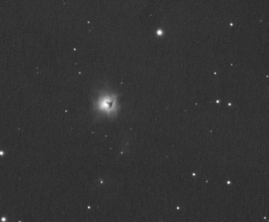A really pretty and symmetric planetary nebula. There is a bright core that is surrounded by a fainter annular ring. This ring is separated from the core by a darker area, so without looking at a Hubble image first, is probably the background sky partially showing through. Touching this ring is another adjacent fainter ring that extends about 20 arcsec from the core centre. Within the NW corner of this outer ring is the 14.6 mag star 4UCAC387-005182. Just to the West is an interesting arrangement of 13.2 – 14.5 mag stars.
