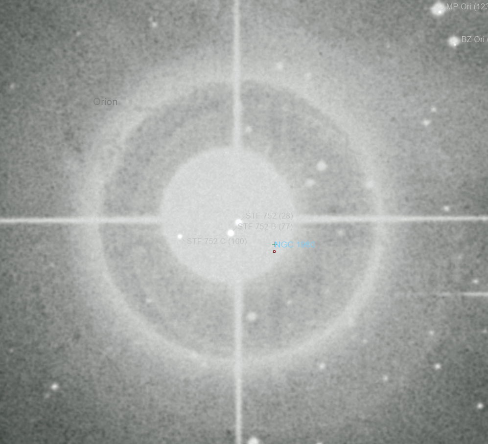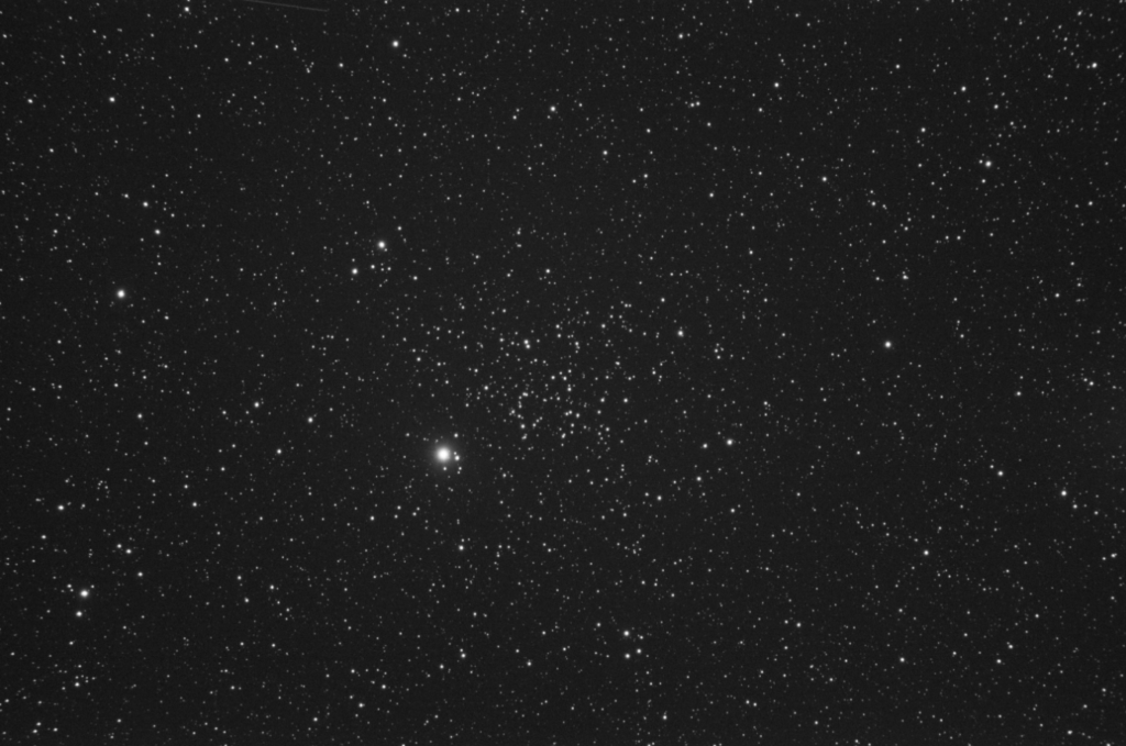 A small 12 arcmin cluster embedded within the outer reaches of M41. Three very bright stars dominate here. The 2.7 mag Iota Orionis at the centre which is also known as Struve 752 which is a triple star system The two other components are Struve 752B 7.7 mag and Struve 752C 10.0 mag. I cannot make out the B component as the light of this is dwarfed by the principle star, but I can see the c component in the image. The separation of these two is 50 arcsecs.