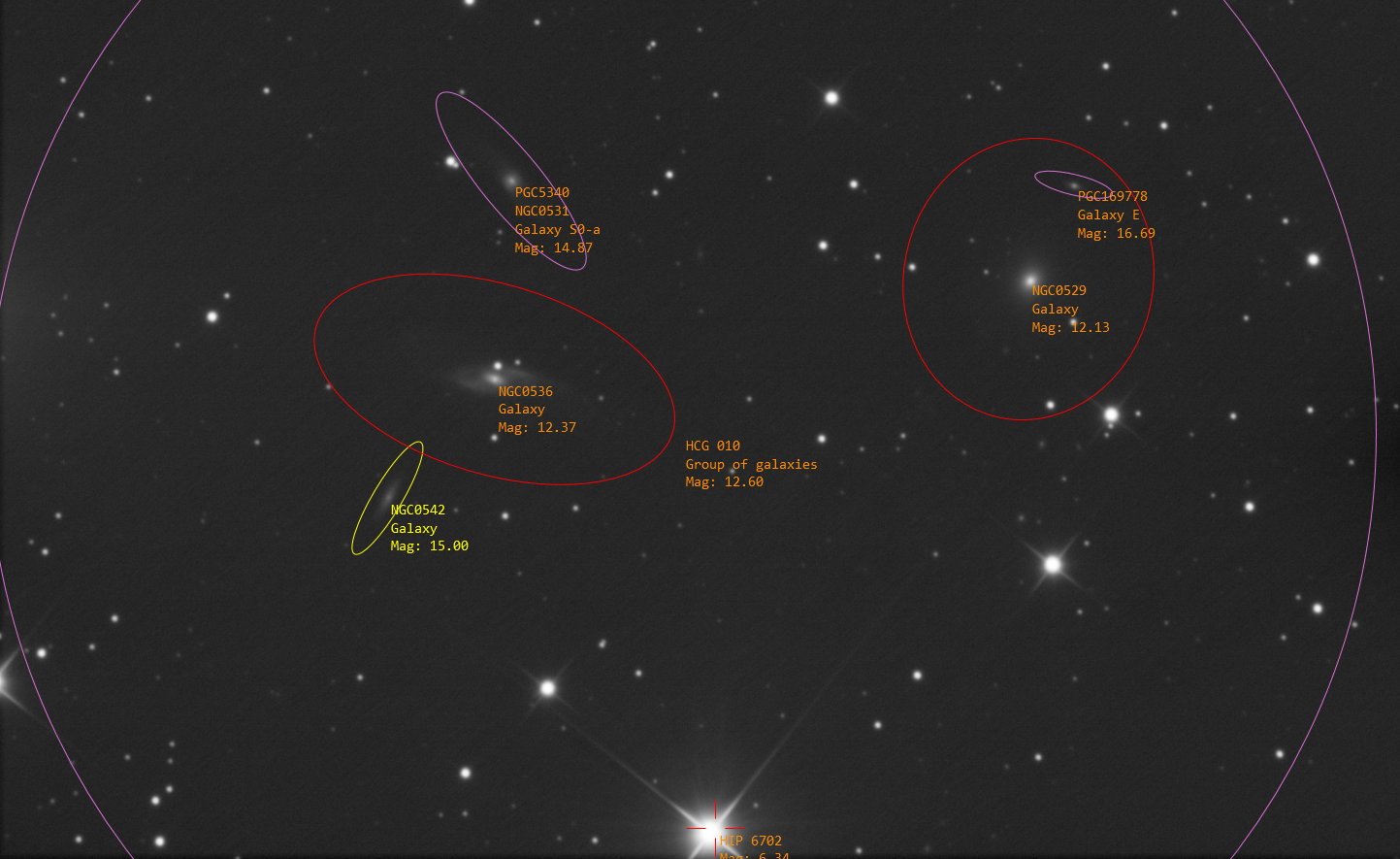 This group contains four NGC objects. From the East they are NGC542 ( Scd), NGC536 (SBb), NGC531(SB:0a) and NGC529 (E4) . I’m also picking up PGC169778 (E) just to the NW of NGC529. All of these are to the North of a 6.3 mag star HIP6702. All of these galaxies are in the distance range of 66 – 69 Mpc. Of the four component NGC galaxies, only one is an elliptical.