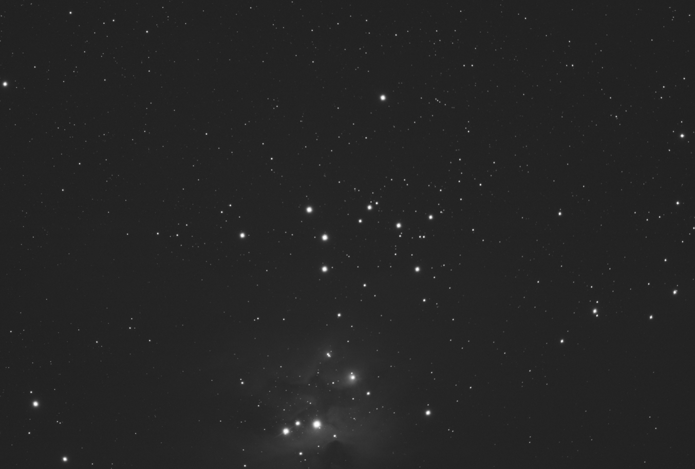 There is a line of stars that looks like a scythe with a short blade that starts North of Iota Orionis curving to the West and then South all the way to the bottom of the frame.