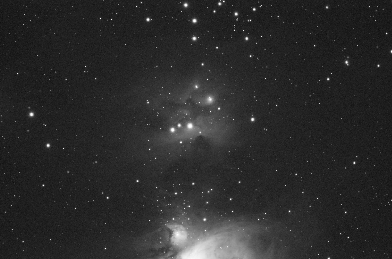 Within NGC1977 are two other NGC objects. NGC1973, which from my image looks like the nebulosity of gas that surrounds the star HD36958. Just to the West of this is a vertical band of dark dust silhouetted by the brighter nebulosity behind it. As with all these illuminated dust here, this is reflected light, rather than emission for the most part I think.
