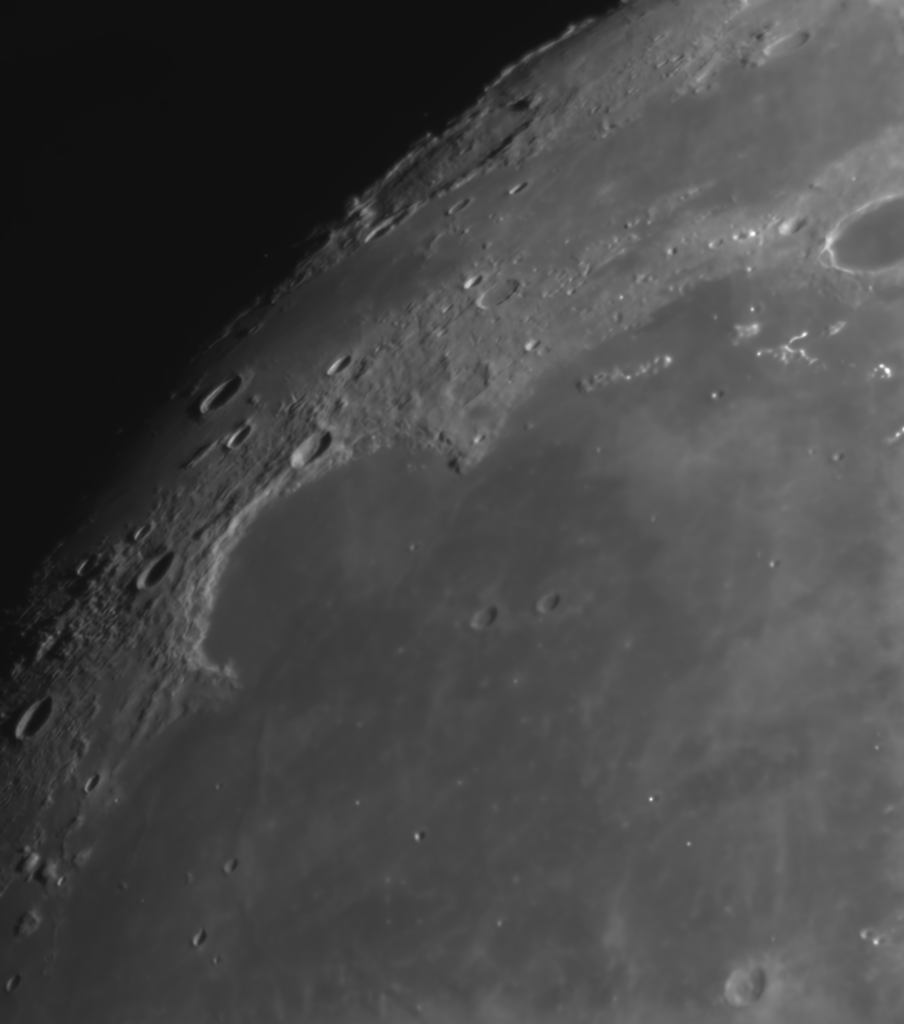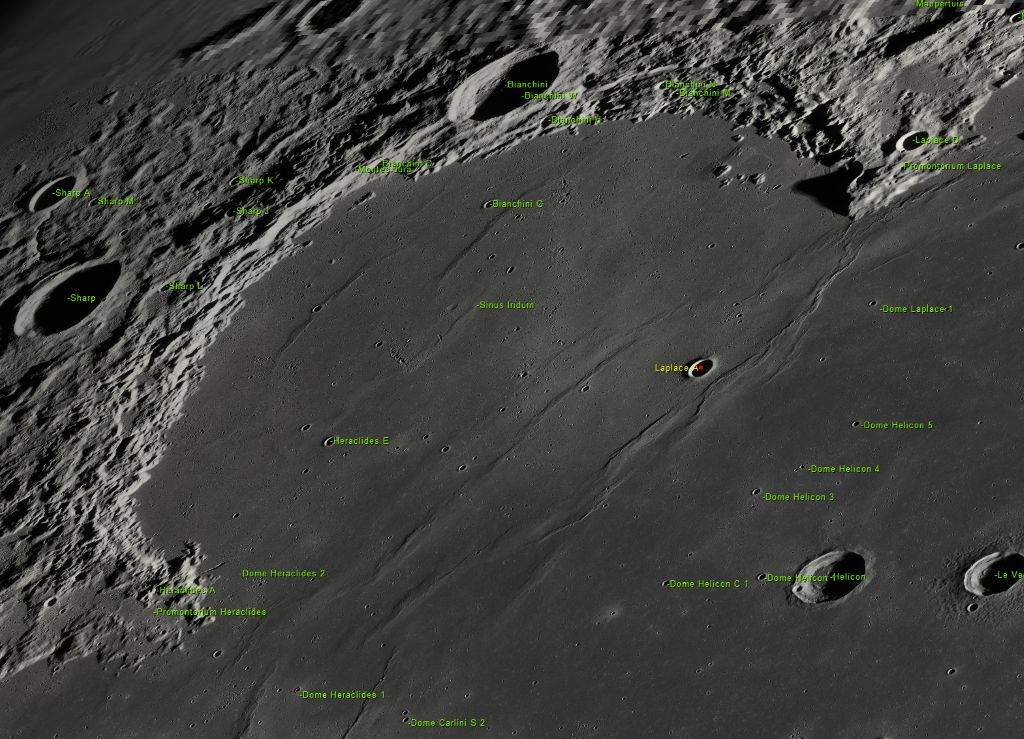 LROC shows a number of what I will call wrinkle ridges within the basin, but the scope is not resolving any of these. There is just a hint of the 4km crater Heraclides E to the West and the more easily seen Laplace A to the East.