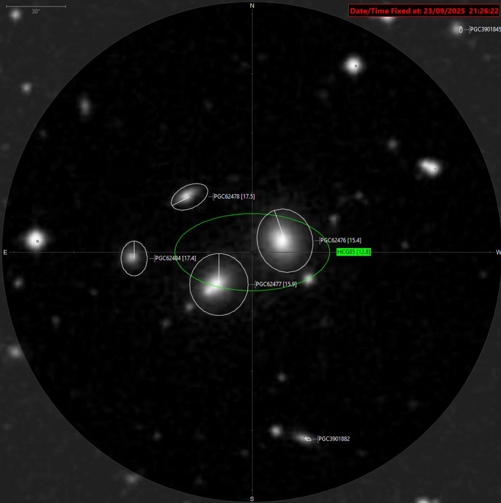 HCG85 consists of four galaxies – PGC62478, PGC62476, PGC62477, PGC62484 all ellipticals, although PGC62478 at 100% looks to have a Northwest/Southeast bias of the outer halo. This was confirmed with the PGC size data when overlaid on the image afterwards.