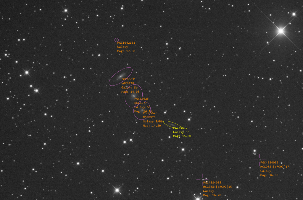To the the Southwest of this is NGC6977 , a 14.1 mag S class spiral which appears to be almost face onto the observer. The core is bright, but diffuse. My image shows what looks like to be a spiral arm to the South that curves towards the East by about 35 arc sec.