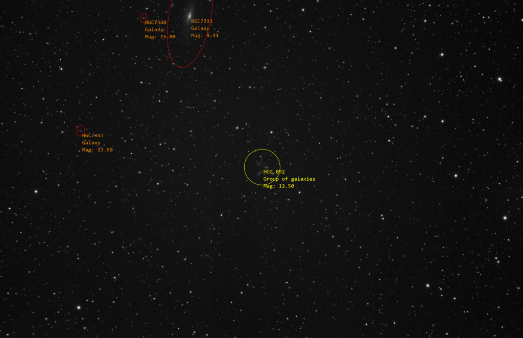 What I didn’t get with the narrower FOV of the larger scope was NGC7343 to the East and the Little and large galaxies of NGC7340 and NGC7331 at the Northeastern edge of the frame.