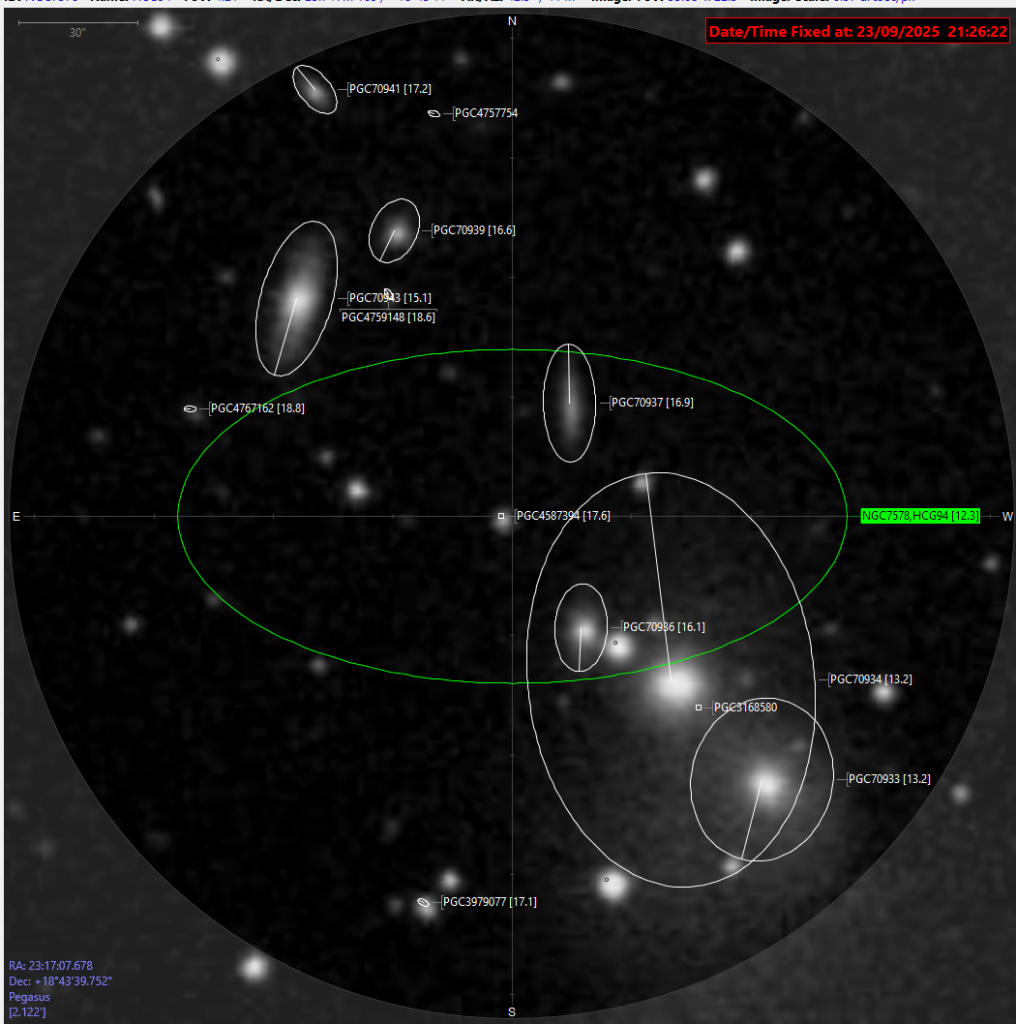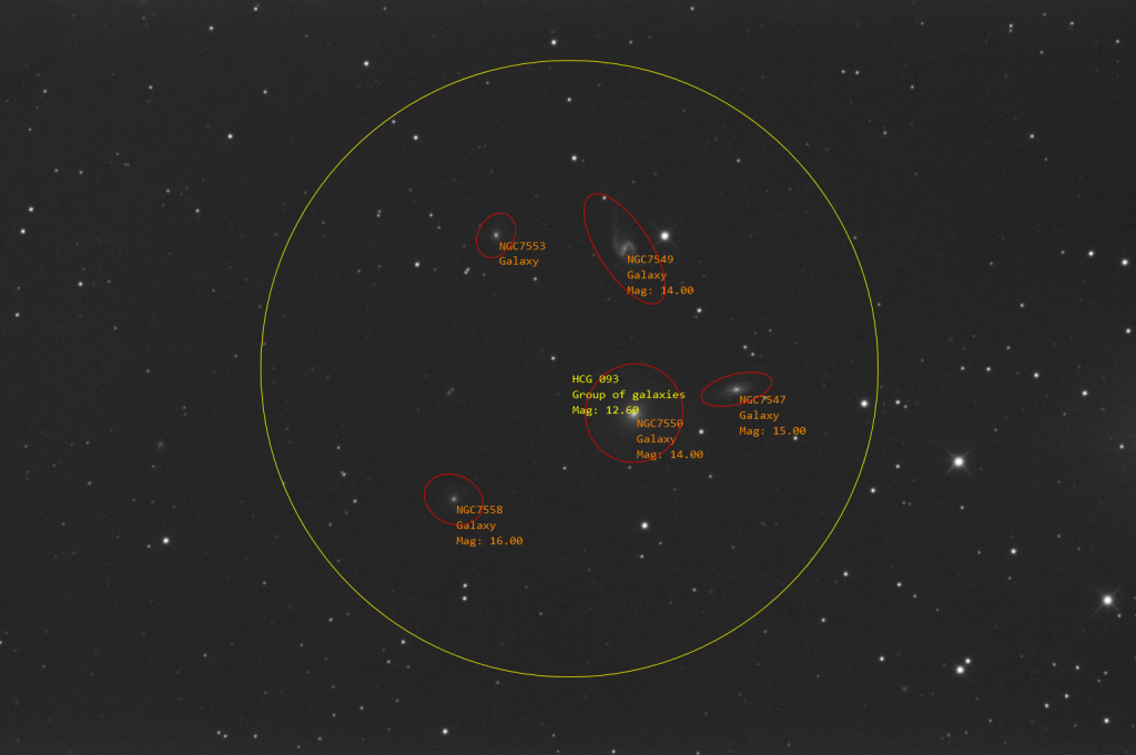 To the East of this is NGC7550, a 13.9 mag E4 type elliptical. Consisting of a bright core with a fainter inner halo, that fades out even further as it diffuses into the background sky.