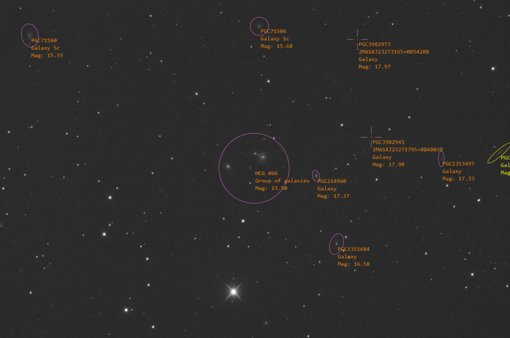 It consists of four galaxies starting North and working Clockwise being PGC71505, NGC7674, PGC71507 and NGC7675. The largest and most interesting is NGC7674, a 14.0 mag SBbc spiral which is face onto us. The arms look to be rotating in and anti-clockwise direction and appears to be very symmetrical. The Northern arms tail looks a lot longer in the image and disappears when it gets just South of West. The core is bright and round. It has a companion galaxy PGC71505.
