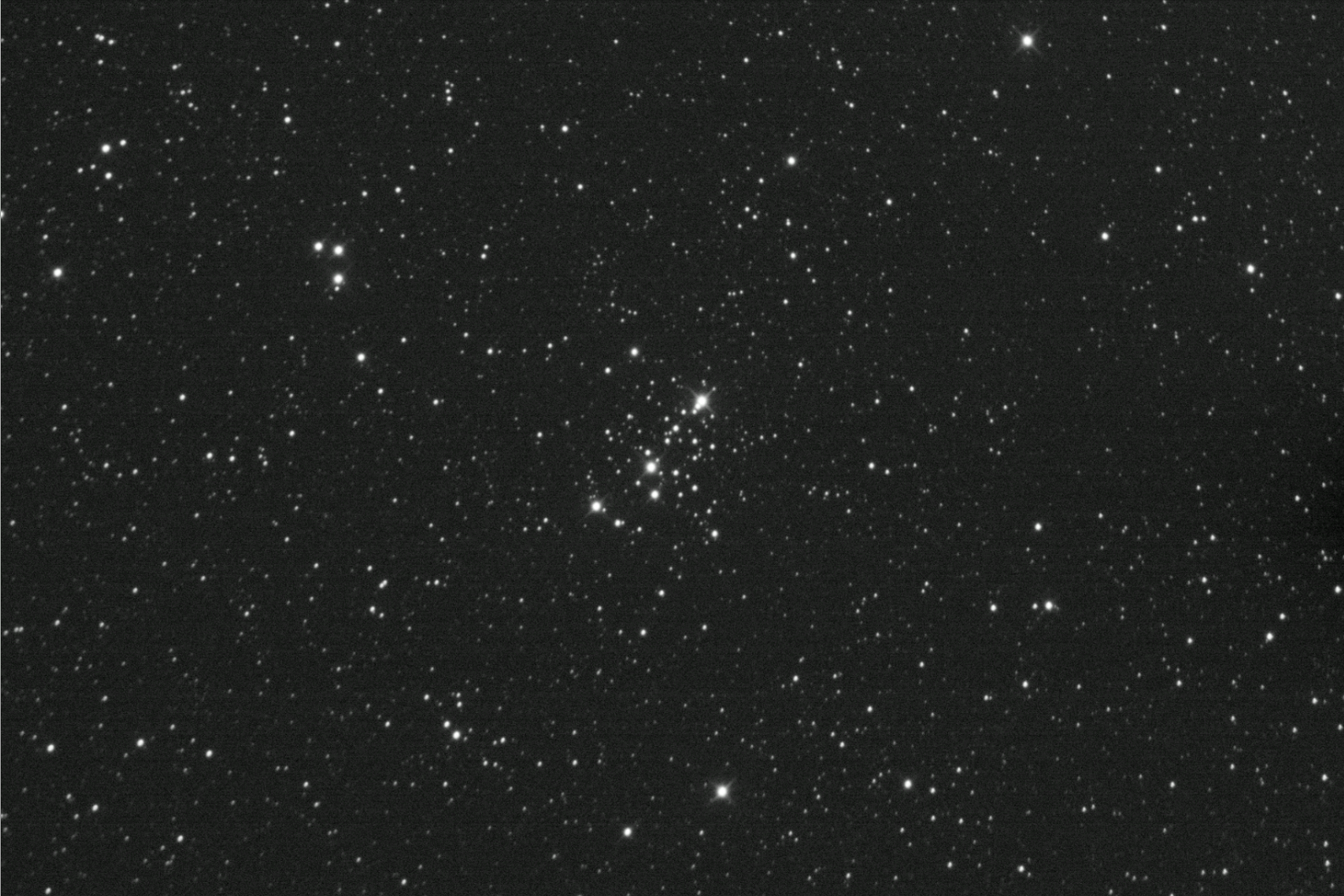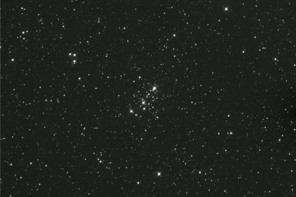 We have three bright stars forming a line with a PA of 315 degrees covering a circle of about 7 arc min. Right angles to this facing Southeast you see a line of a number of stars of varying brightness 10.0 – 11.0 mag. The rest of the cluster contains 13.0 – 14.0 mag stars of which there about 18 or so.