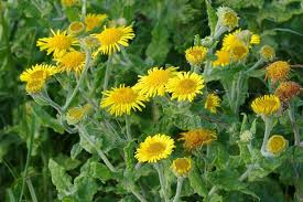 HEIGHT to 50cm Creeping perennial with upright, branched, woolly flowering stems. Grows in damp meadows and ditches on heavy soils. FLOWERS In heads 15–30mm across, with spreading yellow ray florets and deeper yellow, central disc florets; in open clusters (July–Sep). FRUITS Achenes with a hairy pappus. LEAVES Heart-shaped, clasping the stem; basal leaves soon wither. STATUS Common, except in Scotland.