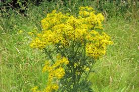 HEIGHT to 1m Hairless, poisonous biennial or short-lived perennial. Grows in grassland; thrives in grazed areas (animals avoid eating the living plant). Food plant of Cinnabar Moth larvae. FLOWERS Yellow, in heads 15–25mm across, carried in dense, flat-topped clusters (June–Nov). FRUITS Those of disc florets downy; ray floret fruits hairless. LEAVES Pinnate with a blunt end lobe. STATUS Common and widespread.