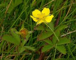 HEIGHT to 30cm Creeping, downy perennial of grassy places, heaths and moors. FLOWERS 7–11mm across, with 4 yellow petals; on slender stalks (May–Sep). FRUITS Dry, papery. LEAVES Unstalked, trifoliate but appear 5-lobed because of 2 large, leaflet-like stipules at the base. STATUS Widespread and often abundant. Trailing Tormentil P. anglica is similar but, like the next species, it roots at the nodes. Widespread but local.