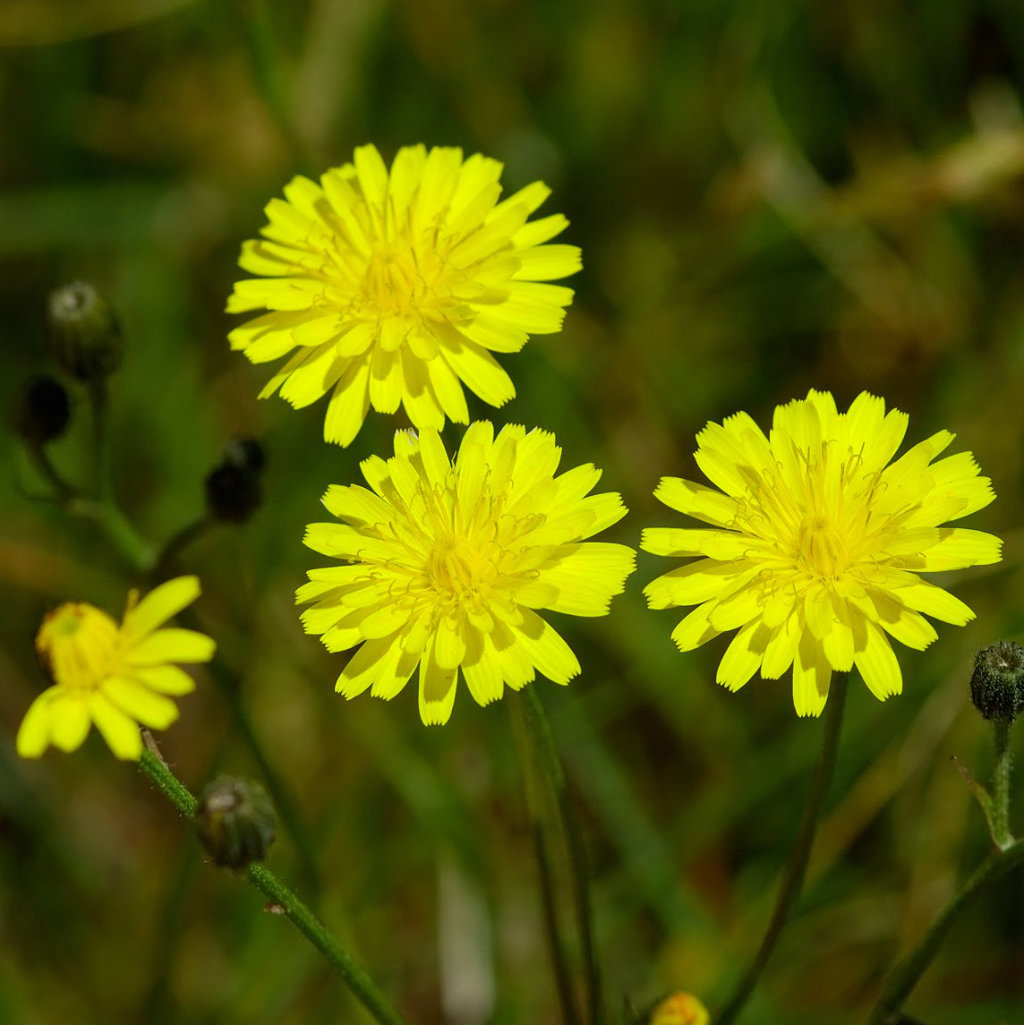 HEIGHT to 80cm Hairless, branched annual or biennial of dry, grassy places. FLOWERS In heads 15–25mm across, with yellow florets and 2 rows of bracts, the outer ones spreading; heads in branched clusters (June–Oct). FRUITS With a pappus of unbranched hairs. LEAVES Pinnate, upper ones with clasping, arrow-shaped bases. STATUS Common.